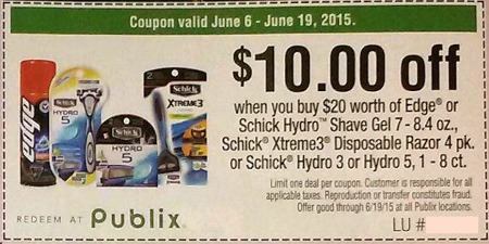 -$10/$20 Edge or Schick Hydro Shave Gel 7 – 8.4 oz, Schick Xtreme3 Disposable Razor 4 pk or Schick Hydro 3 or Hydro 5, 1 – 8ct Health & Beauty Advantage Buy Flyer In-Ad Publix Coupon (valid 6/6 to 6/19)