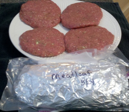Another thing to keep in mind is the quantity you purchase. While I may only need one pound of beef for a specific meal in a week…if I have money in my budget it would make more sense to grab a larger package of beef while it is on sale and pop it in the freezer for another week. That way I will have more options the next week…and more flexibility with my budget. If you are like me and short on time ALL the time…consider prepping multiple meals all at once. Tonight is a great example. I had two pounds of beef. Instead of using one pound and freezing the other, I chose to prep both pounds to save me time later on. For dinner tonight we are having roasted red pepper and feta stuffed burgers. I mixed up the beef based on my recipe and divided it. Half was formed into patties and stuffed with feta and tomatoes and the other half was formed into a meatloaf. I then wrapped the loaf, labeled it and popped it into the freezer. At some point soon, I can defrost the loaf and then just pop it in the oven for a super easy meal without any prep!!