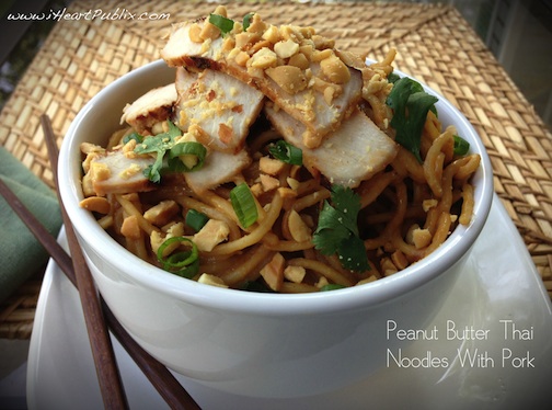 When I saw the deals on Peter Pan Peanut Butter and the BOGO sale on pork chops, I knew exactly what was on the menu this week – Peanut Butter Thai Noodles With Pork!