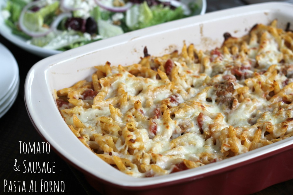 Today I have a super easy recipe for you guys that is something most of you can put together with what you have on hand – Tomato & Sausage Pasta Al Forno.