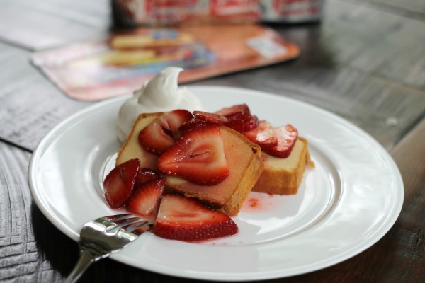 The pound cake is perfect -just heat it up in the oven or microwave and in minutes, you’ll have a warm, delectable cake that tastes homemade! Just top with your favorite fruit or flavored topping for a perfect no-fuss treat when you need to impress guests in a hurry! I went with strawberries this time but I am going to do cherries next – YUM!
