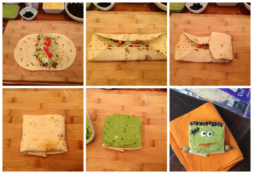 I start with a Flatout flatbread and fill it with the standard taco fixings. I then fold the Flatout a few times to create a square that contains all those yummy fillings. A quick spread of guacamole followed by creatively placed sour cream, black beans, olives and a tomato slice and the Flatout Franken-Taco comes to life!