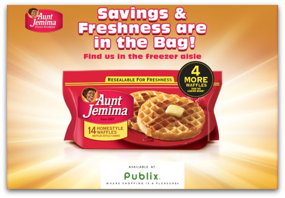 Did you guys see that awesome deal on Aunt Jemima Waffles in the Publix ad that started today? Wowsa – we’ll be able to grab a bag as low as 60¢ after coupon. Heck, even without a coupon that’s a stock up price!