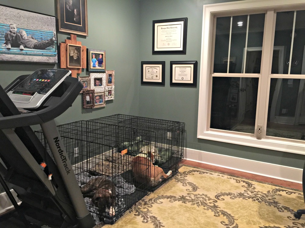 This is a room that I share with my pups. They get to play outside during the day but they sleep in their crates at night.