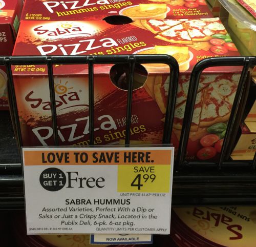 - 6-Pack Sabra Hummus, Assorted Varieties, Located in the Publix Deli, 6 oz, BOGO $4.99