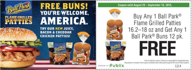 -FREE Ball Park Buns, 12 ct, wyb Any (1) Ball Park Flame Grilled Patties, 16.2 to 18 oz Grocery Advantage Buy Flyer “Gametime Deals” In-Ad Publix Coupon (valid 8/29 to 9/18)