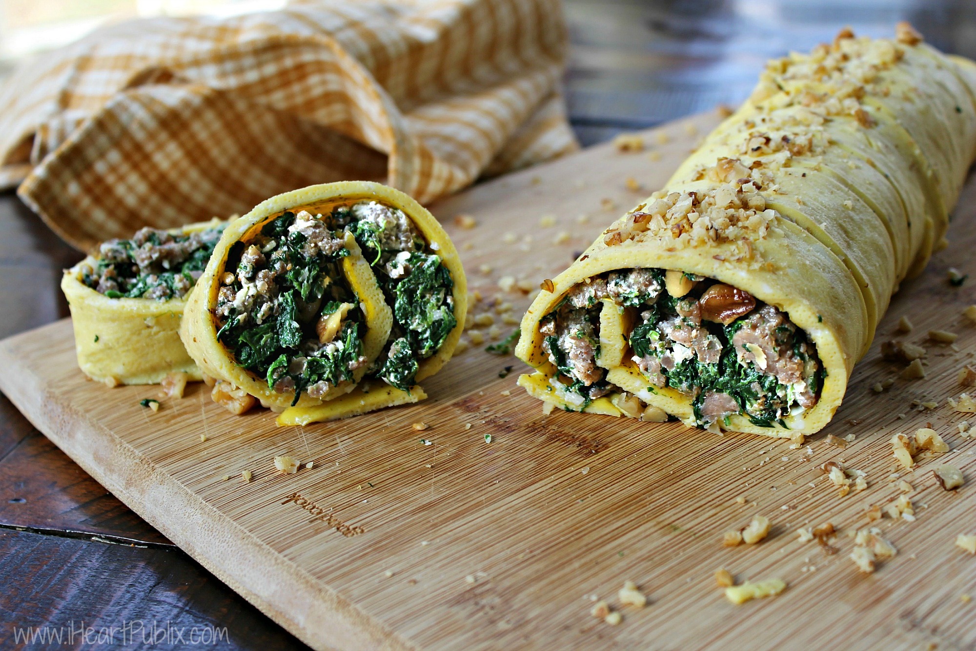 Once the sausage is done you simply mix it with the spinach, goat cheese, walnuts and then you ready to assemble your roulade. For that you just spread the sausage mixture over the cooked eggs and use the parchment to carefully roll the eggs lengthwise over the filling. Sprinkle with more walnuts and serve with tomatoes and sour cream. See…I told you it was simple!