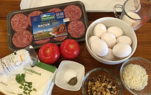 The first step is getting the eggs ready. All you do is beat 8 eggs with a little milk, salt and pepper. Those go in a parchment lined pan then into the oven to bake for about 10 minutes. While the eggs bake, grab a package of Farmland sausage and fry it up. Farmland Homestyle Sausage is gluten free with no MSG, full of the delicious all natural flavor you crave to start your day.