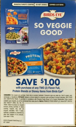 I thought you guys might like to know to stop by the Apron’s station when you shop this week and look for some nice savings on your favorite Birds Eye veggies! Look for a great coupon that will save you $1 off any two Flavor Full, Protein Blends or Disney items from Birds Eye®.