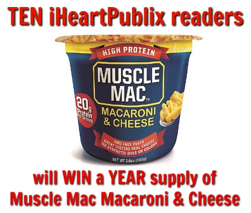 I have some good news! The folks at Quality Pasta have offered to give TEN iHeartPublix reader a FREE year supply of Muscle Mac Macaroni & Cheese! Each reader will get 3 cases (each case includes 12 cups) of Muscle Mac Macaroni & Cheese cups! So if you want to send them to your kiddo’s dorm room, they’ll make sure they get there!