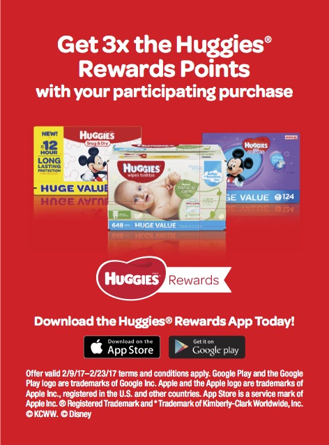 Participating purchases made 2/9/17-2/23/17 will earn 3x Huggies Reward Points that can be redeemed for some great rewards like diapers, gift cards and more! If you aren’t already a Huggies Rewards member, just grab the app for your mobile device then just upload your receipts and start earning those points.