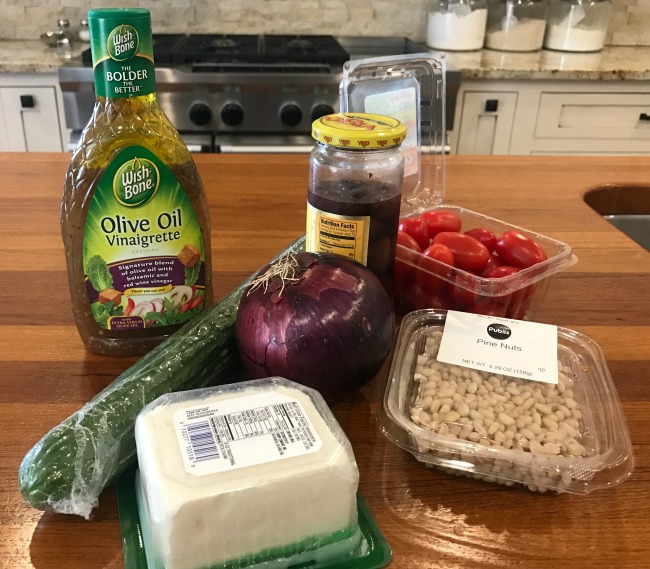 Yep, you don’t have to use a knife or whip out your mandolin to get perfect thin strips of tasty cucumber. Simply use a standard vegetable peeler and run down the length of the cucumber to create ribbons. Pile those ribbons on a plate and add some red onion, feta cheese, Kalamata olives, tomatoes and a few toasted pine nuts. For the final touch, drizzle the salad with a delicious vinaigrette. I love the Olive Oil Vinaigrette from Wish-Bone®. It enhances all the tasty ingredients and makes this salad pop with flavor!