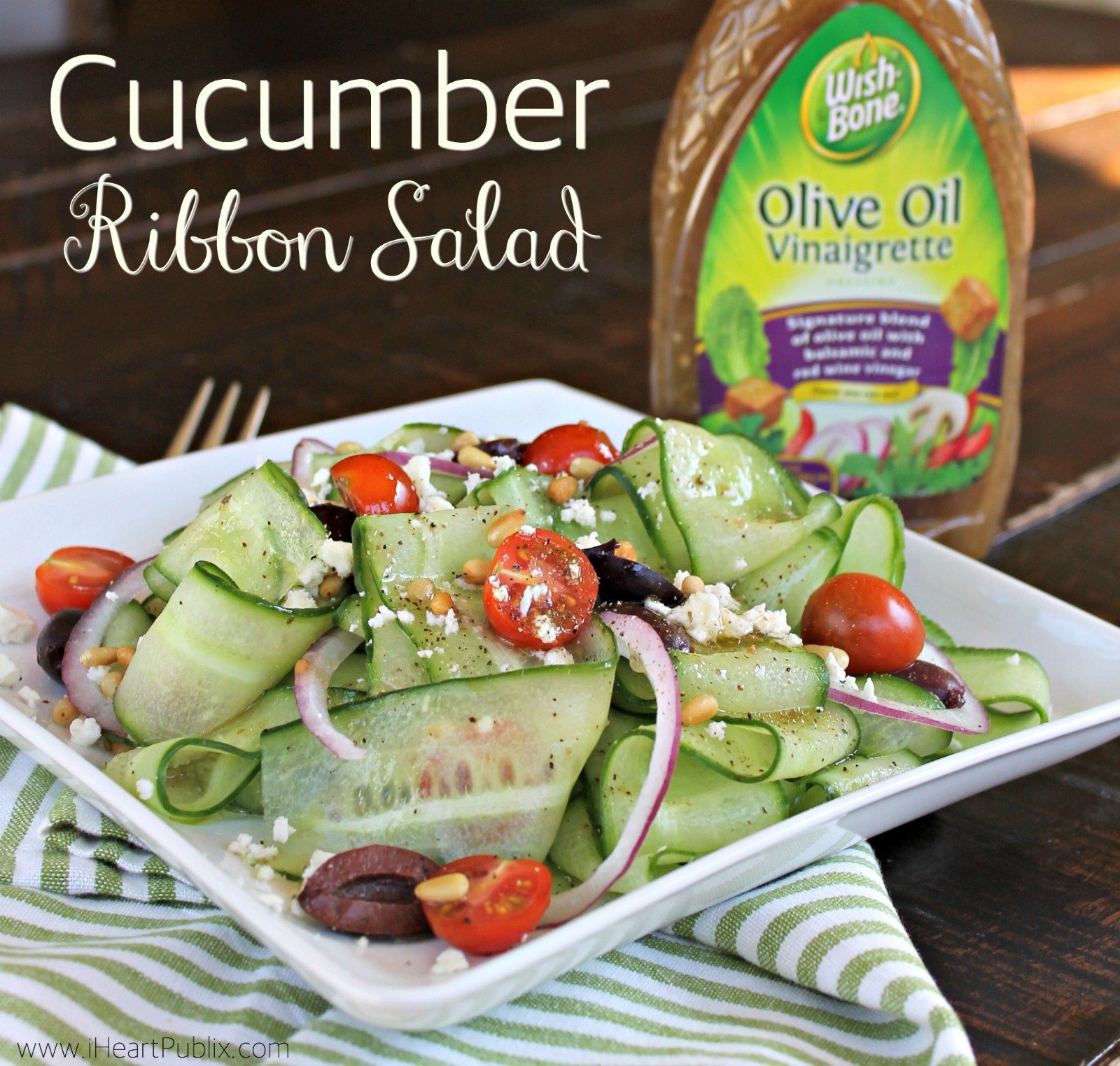 Be sure to stop by Publix and grab a couple of cucumbers while they are on sale. Then stroll down the dressing aisle and pick up your favorite Wish-Bone varieties. Any good Italian or vinaigrette dressing will work great on this salad. With so many options it might be hard to choose just one! You can choose from a huge selection of dressings including their new Wish-Bone Extra Virgin Olive Oil Dressings and the Wish-Bone Ristorante Italiano line.