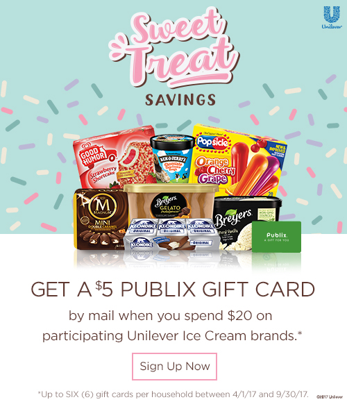 Unilever and Publix are coming together to offer you Sweet Treat Savings on your frozen favorites. You can earn a $5 Publix gift card for every $20 spent on Unilever ice cream.