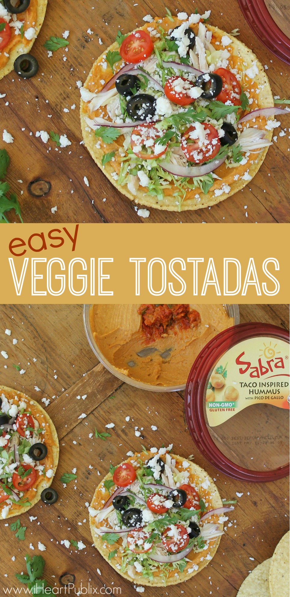 Sabra Hummus is tasty as a snack with your favorite chips, pretzels or veggies and it’s also amazing when you add it to your favorite recipes. When I need a tasty meal that I can have ready in a flash, I whip up a batch of these Easy Veggie Tostadas. With a tub of hummus and the veggies that I have on hand, I can serve up a tasty tostada that’s ready in just minutes. I’ll often just throw out a bunch of toppings and let everyone build their own tostada just how they like it. The base of Sabra Taco Inspired Hummus with Pico de Gallo is an amazing base and then you add whatever you love. Heck, you can even add ground beef, pork or chicken if you’d like. The options are endless!