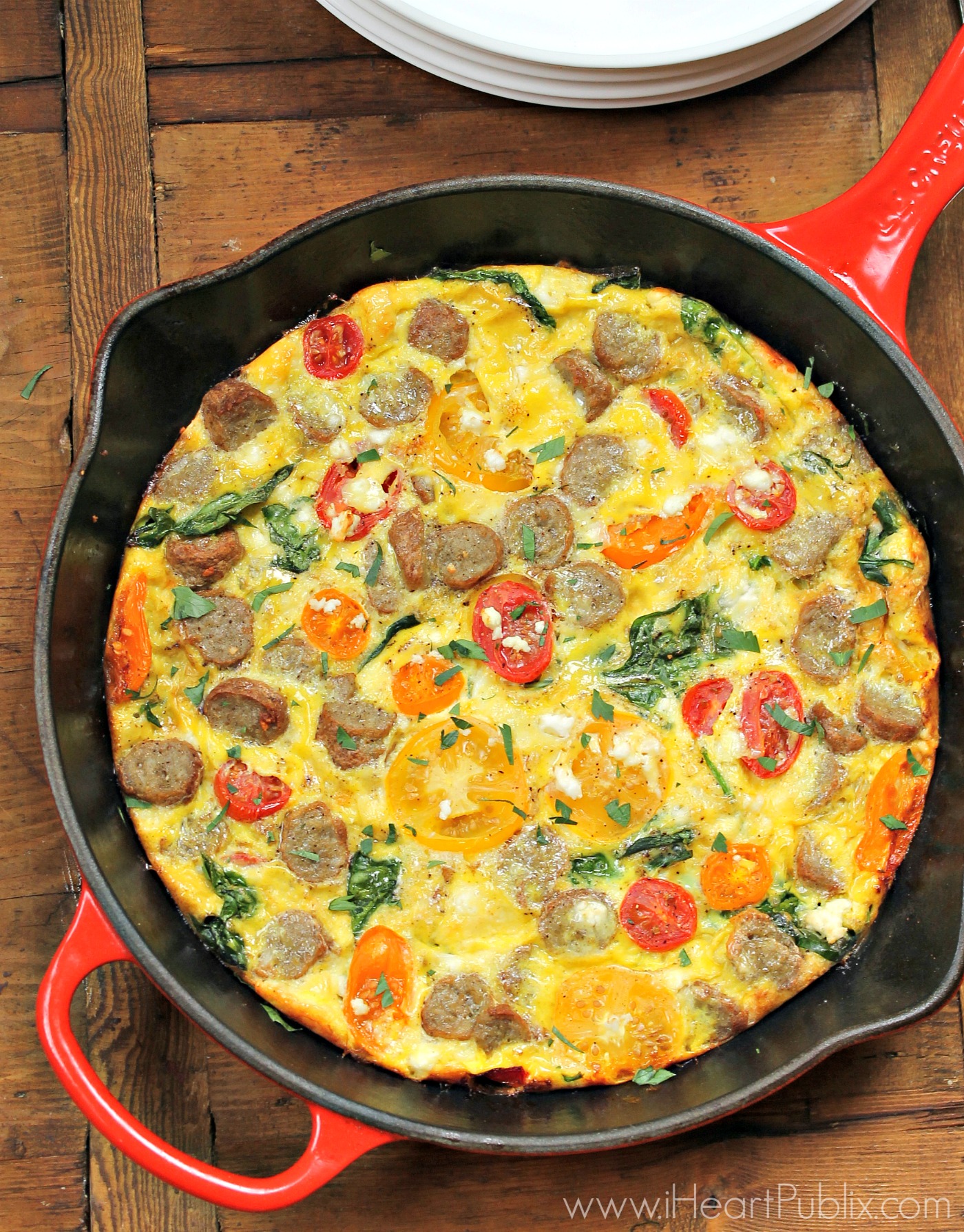 My Baked Sausage & Tomato Omelet is a super simple recipe that you can do pretty much any day of the week. All you have to do is throw everything in a pan and then just pop it in the oven. No need to cook up a bunch of individual omelets and spend all that time at the stove. You get the same delicious taste with almost no prep and basically no active cooking. This is one of my favorite things to make when I have a large group of folks. I can do two pans and feed a big group with very little effort.