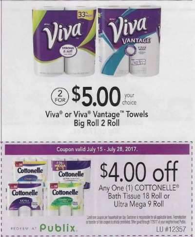(2)$4/1 Cottonelle Bath Tissue, 18 Roll, or Ultra Mega, 9 Roll Health & Beauty Advantage Buy Flyer In-Ad Publix Coupon (valid 7/15 to 7/28)