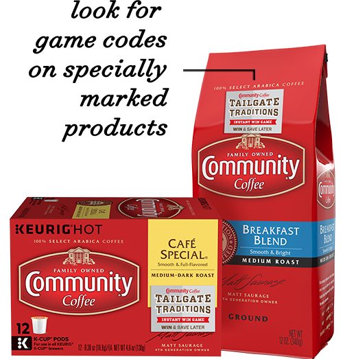 Grab your coupons and save up to $2 off each bag/K-Cup® box that you purchase. Be sure to look for packages with the code and then enter them on the Community Coffee Tailgate Traditions Game page for your chance to win big!