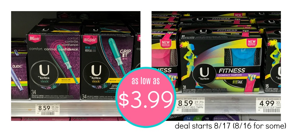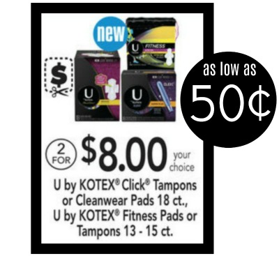 To start with…there is a deal that started today as part of our new Advantage Buy flyer. Look for U by Kotex Click Tampons, Cleanwear or U by Kotex Fitness Pads or Tampons to be priced 2/$8. That’s a nice discount but when you add in coupons and the cash back offers you can grab the boxes as low as 50¢ each!