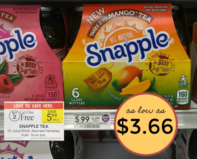 Have you loaded your Snapple coupon? You’ll want to clip it so that it will be available when you shop this week. As a reminder, the packs are on sale buy two, get one FREE starting 9/21 (9/20 for some)!