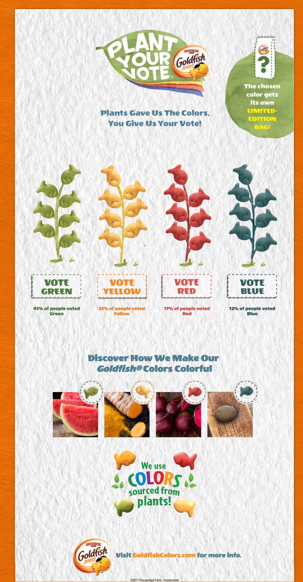 Simply head over to the GoldfishColors.com/Vote page and choose your favorite color. Once the voting concludes, the color with the highest number of votes will get its own limited-edition bag. The limited-edition bag will then be available at Publix in April and May 2018.
