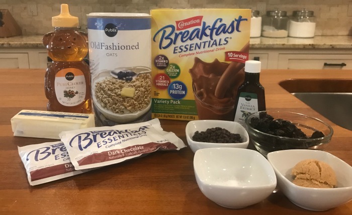 The great thing about granola bars is that you can customize them to suit your taste. Add nuts, coconut, dried fruits or really anything that strikes you fancy. We happen to be chocolate lovers so almost all of my recipes will start with a basic chocolate flavored bar. To get that chocolatey flavor, I use Carnation Breakfast Essentials® powder!