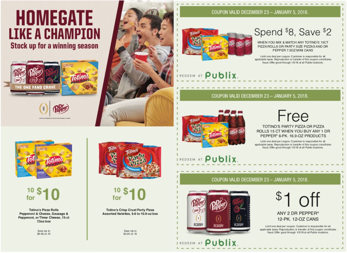 –FREE Totino’s Party Pizza, 9.8 to 10.9 oz, or Pizza Rolls, 15 ct, wyb (1) Dr Pepper Product, 6 pk, 16 to 16.9 oz bottles Grocery Advantage Buy Flyer “Extra Savings” In-Ad Publix Coupon (valid 12/23 to 1/5)
