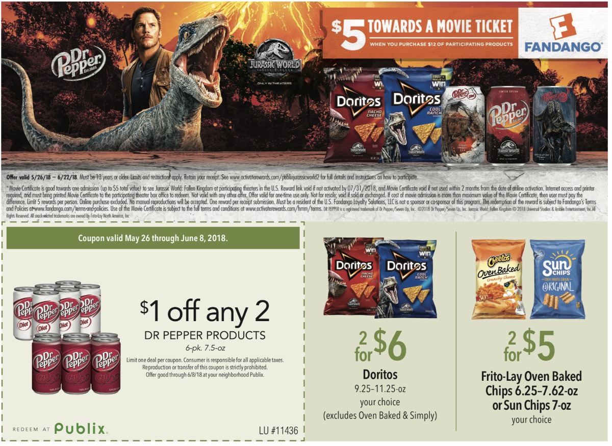 - Purchase $12 of participating Dr Pepper and/or Doritos® products in one or multiple transactions (pretax/post coupon) at participating Publix® stores between 5/26/2018 and 6/22/2018. Retain your receipt.