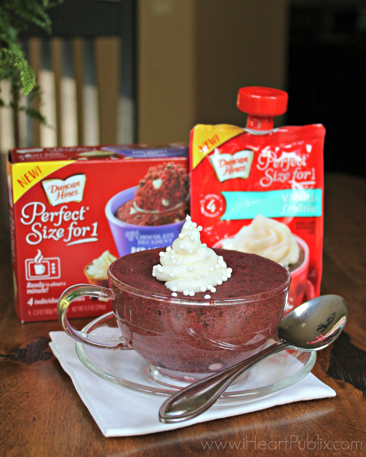 Many of you have probably already finished dinner and are sitting down to relax for the evening. I’d say it’s time for a sweet treat to finish off the day. Now that doesn’t mean you need to go spend another 20 – 30 minutes in the kitchen…just grab one of your favorite Duncan Hines® Perfect Size for 1® mixes and you’ll have happiness in a hot minute!