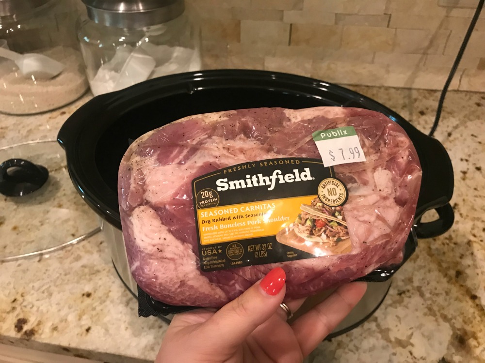1. Place the Smithfield® Boneless Pork Shoulder Seasoned Carnitas in a 2 – 4 quart slow cooker and add the water. Stir to break up the meat.