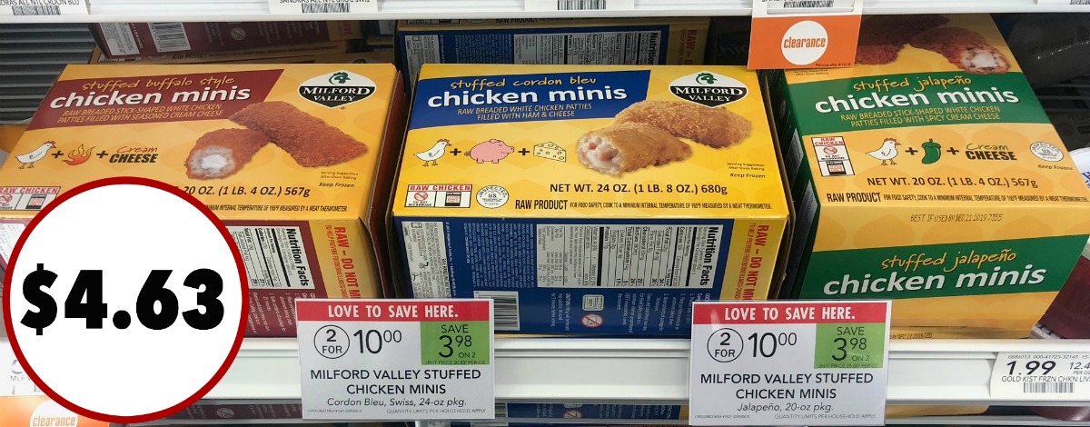 Heads up guys…look for a great deal on all the tasty varieties of Milford Valley Stuffed Chicken Minis this week at Publix! You’ll find them as an unadvertised sale and priced 2/$10 now through 8/29 (8/28 for some). There is a printable coupon that you can sign up for to get an even better deal.