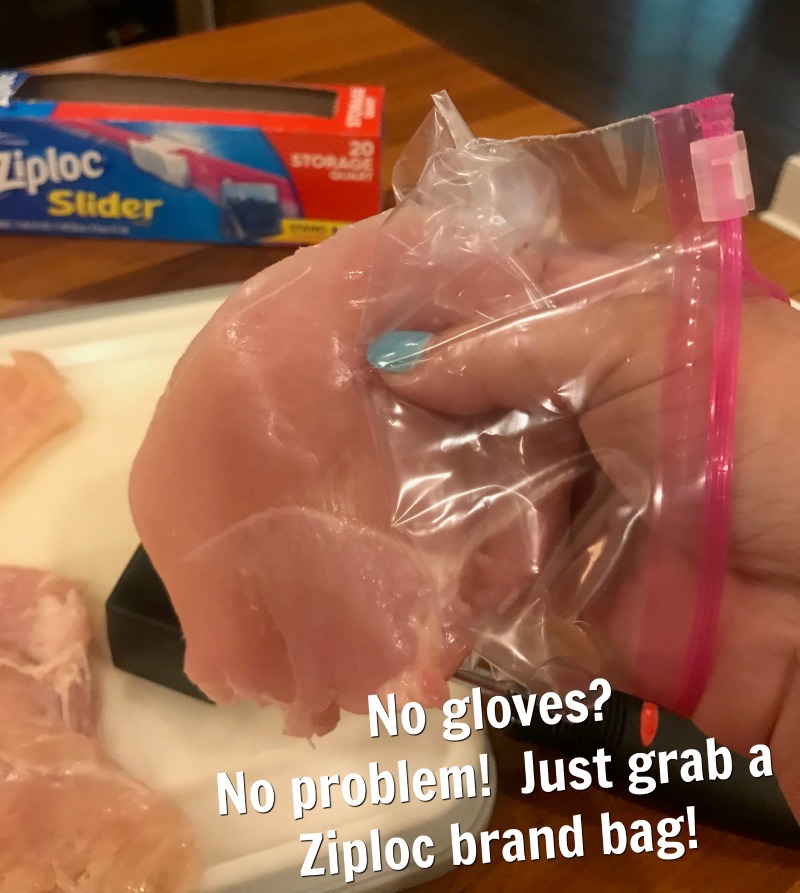But, I use them for so much more than food storage. I find they are incredibly handy when I am cooking and need to keep my hands clean. Have you ever tried to roll out chicken or turkey meatballs? If so, you probably know that the meat will stick to your fingers to the point that rolling out the ball is almost impossible. BUT…if you place a Ziploc® brand bag on each hand, rolling the meatball is easy! The same is true when you shape meatloaf, knead dough, roll cookies or handle any sticky foods.