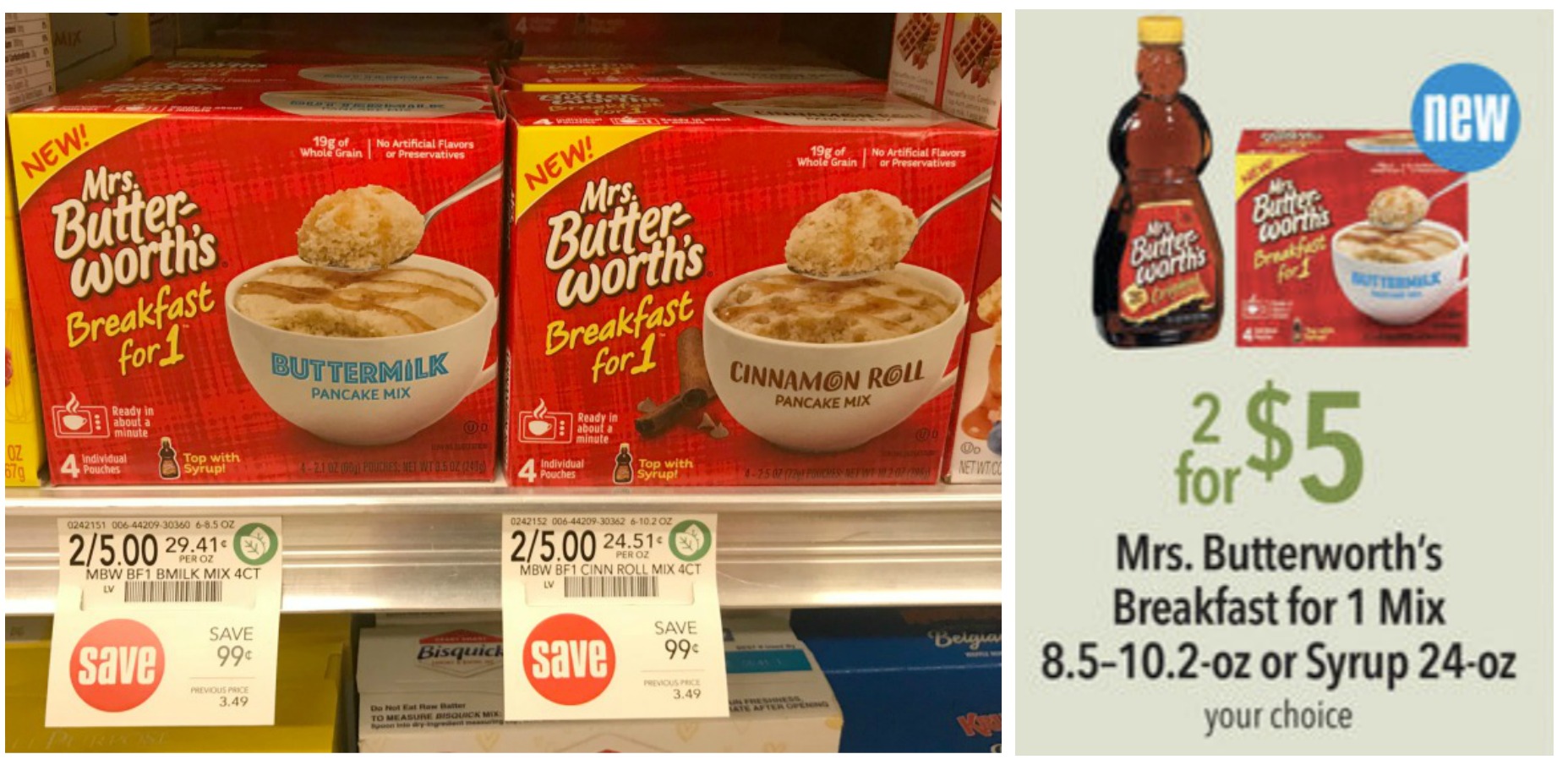 - Mrs. Butterworth’s® Breakfast for 1™ – Buttermilk Pancake Mix, 2/$5