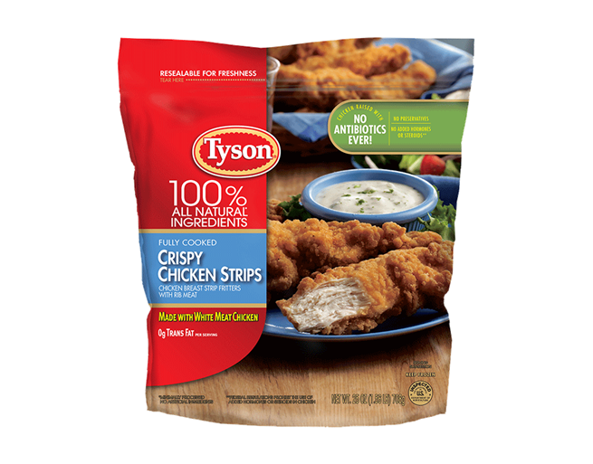 You can feel good adding Tyson Crispy Chicken Strips to your menu. Check the bag and you’ll see why! Look for the seal on the bag and you’ll see that Tyson® Chicken is raised with No Antibiotics Ever! You’ll enjoy great taste from 100% all-natural white meat chicken that’s made with 100% all natural* ingredients.