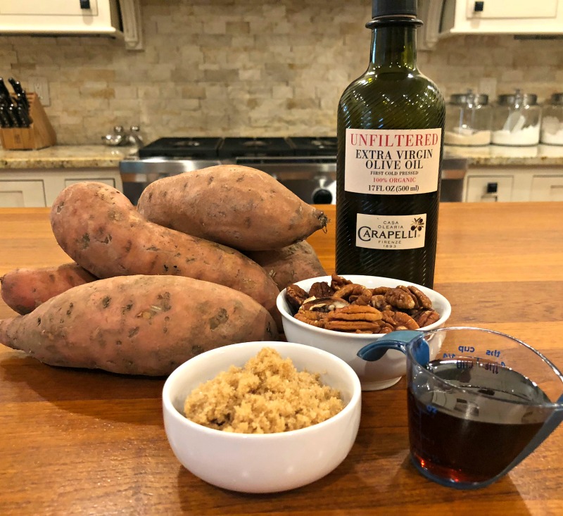 - Combine 1 teaspoon Carapelli Extra Virgin Olive Oil, chopped pecans, maple syrup and brown sugar in a small saucepan over medium low heat.