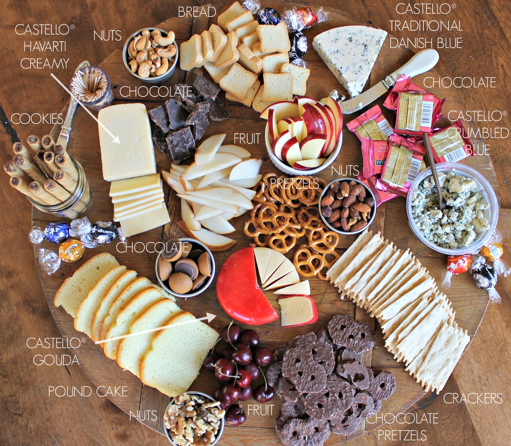 Check out my sweet tray below for some inspiration. Notice that there is a variety of cheeses, chocolates, fruits, nuts and other goodies so that everyone can find the flavor combination that they love!