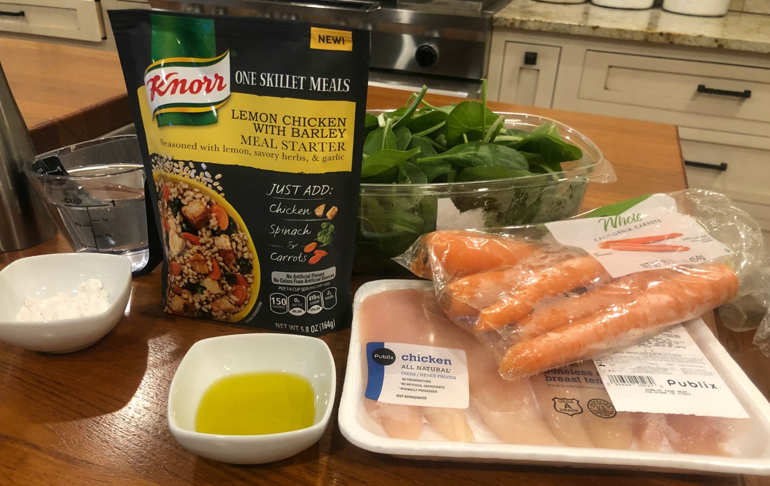 One of my favorite meals to prepare is the Knorr One Skillet Meal of Lemon Chicken with Barley. As you can see by my picture below, you only need a few ingredients. If you’ll count, you’ll see that the entire dish only requires SEVEN ingredients. A bag of Knorr, chicken, carrots and spinach plus a couple of pantry staples (water, oil and flour) all combine for a flavorful meal that’s ready in just minutes.