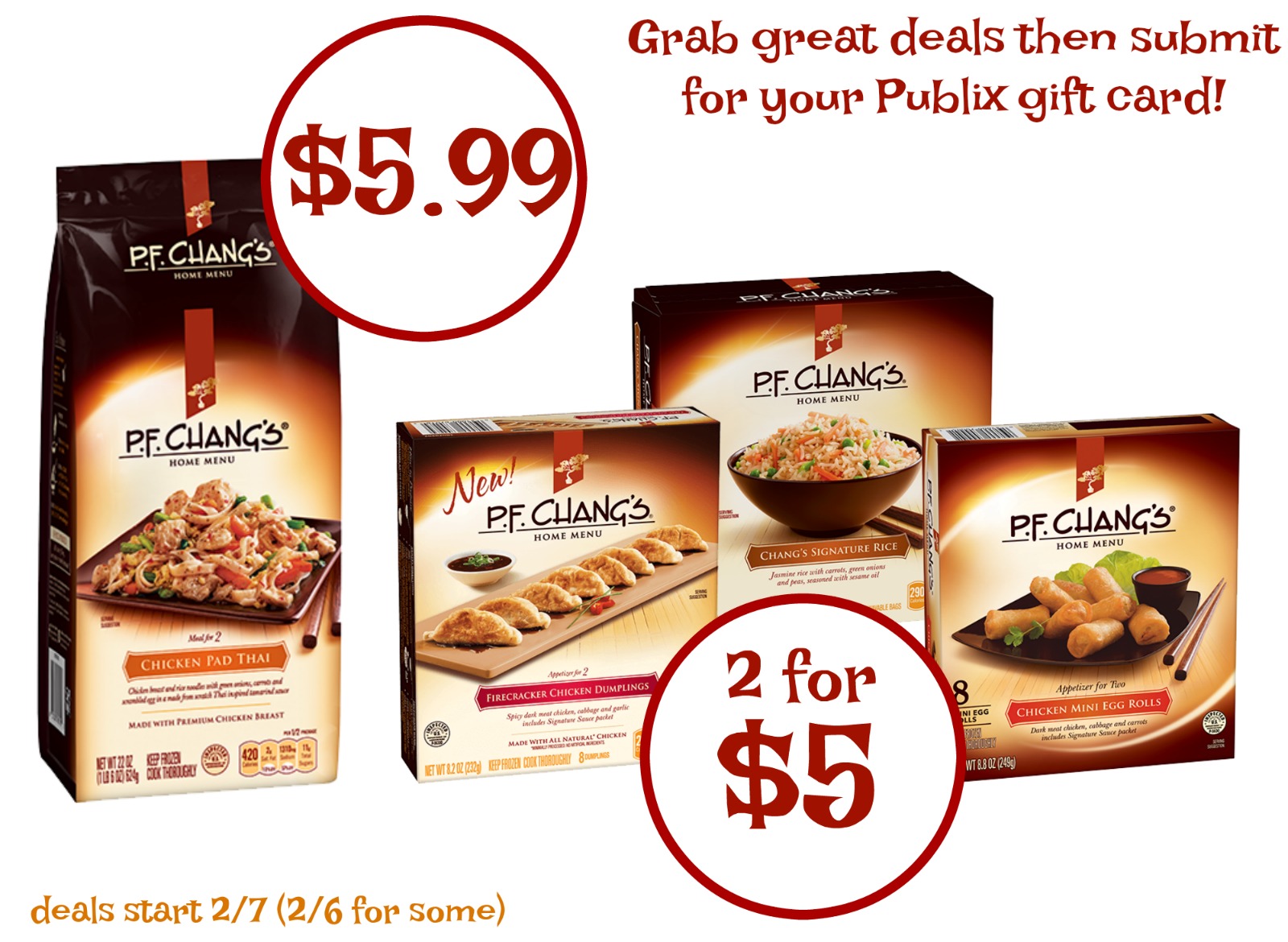 I like to shop the sales to get the most bang for my buck. So, I thought I’d point out a couple of deals that you can get when the new ad starts on 2/7 (2/6 for some). Pick up a super discount on everything you need to enjoy an Asian meal at home. Look for great prices on P.F. Chang’s Home Menu Meals and sides.