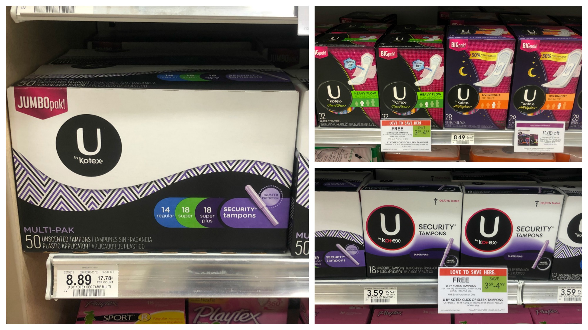 -FREE U by Kotex Tampons 15 or 18 ct pkg or Pantiliners, 36 or 64 ct oz pkg or Pads, 13 to 24 ct pkg WYB U by Kotex Click or Sleek Tampons or Fitness, 31 to 36 ct pkg or Security 50 ct pkg or Pads 26 to 56 ct pkg (save $4.99) In Ad Offer