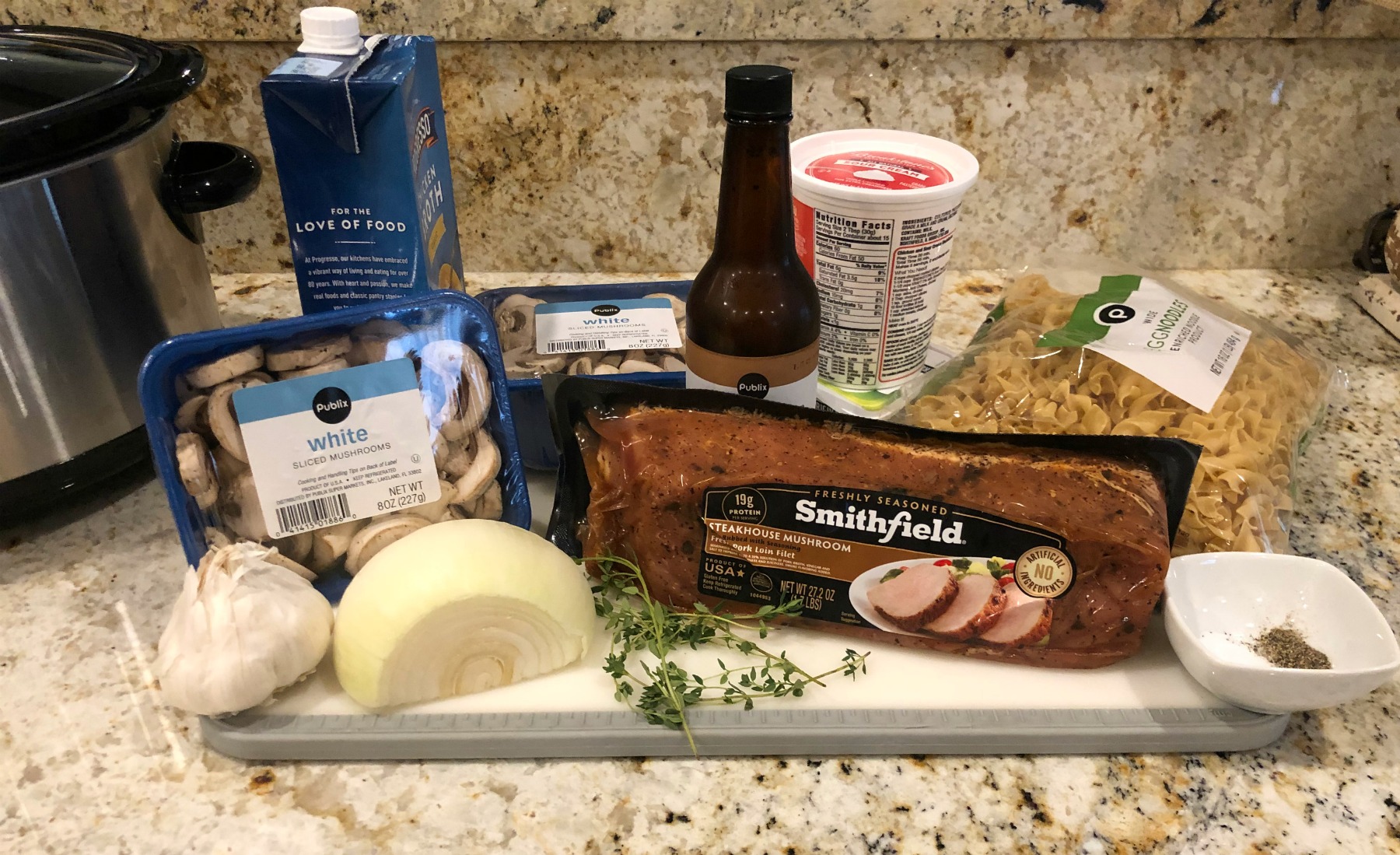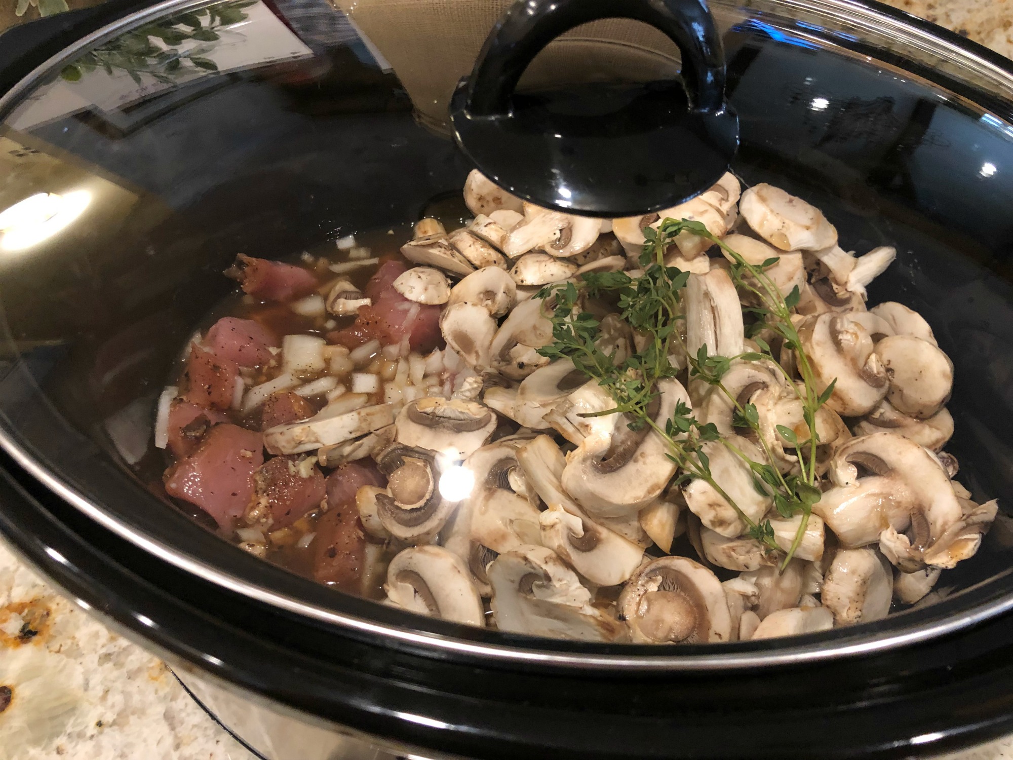 - Add pork, mushrooms, onion, garlic thyme, salt, pepper, Worcestershire sauce and1 1/2 cups chicken broth to the slow cooker.