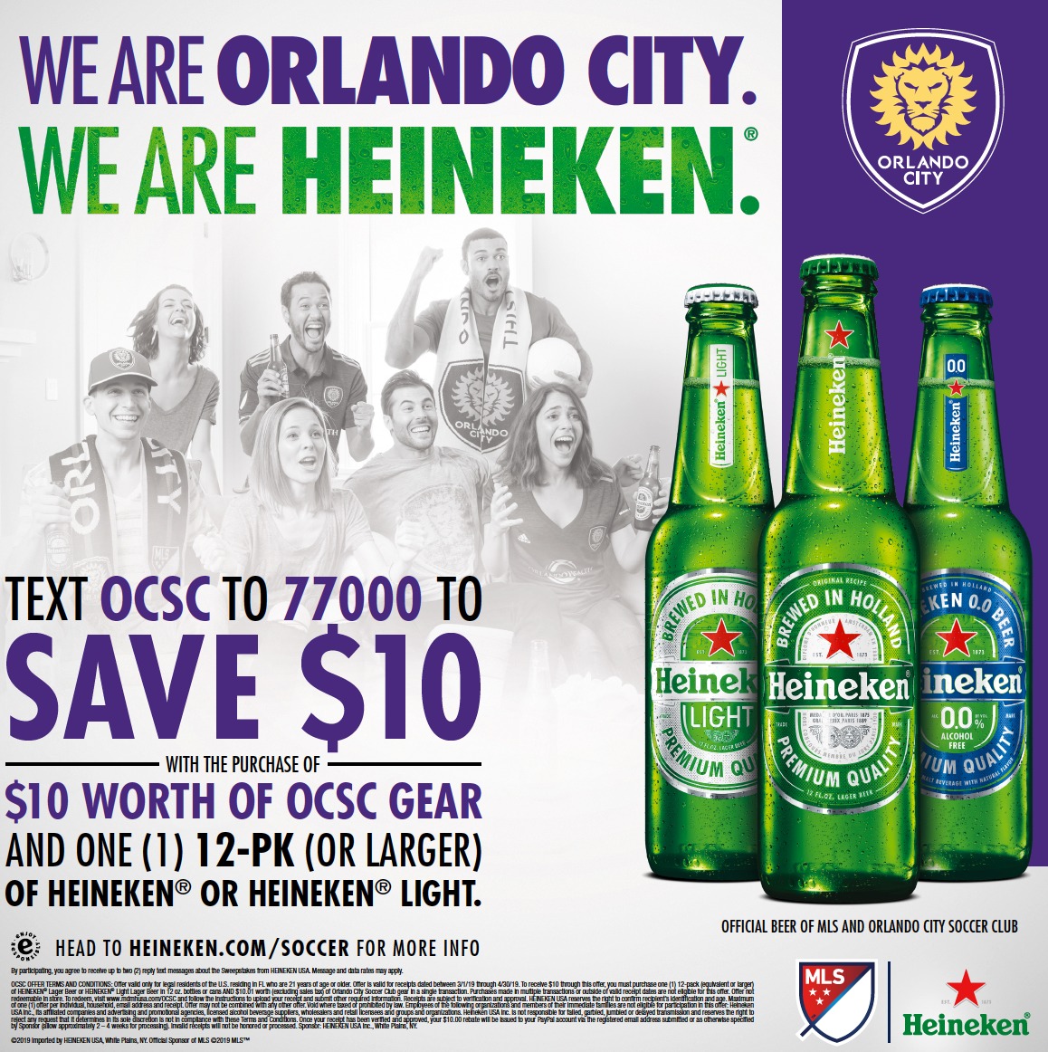 OCSC OFFER TERMS AND CONDITIONS: Offer valid only for legal residents of the U.S. residing in FL who are 21 years of age or older. Offer is valid for receipts dated between 3/1/19 through 4/30/19. To receive $10 through this offer, you must purchase one (1) 12-pack (equivalent or larger) of HEINEKEN® Lager Beer or HEINEKEN® Light Lager Beer in 12 oz. bottles or cans AND $10.01 worth (excluding sales tax) of Orlando City Soccer Club gear in a single transaction. Purchases made in multiple transactions or outside of valid receipt dates are not eligible for this offer. Offer not redeemable in store. To redeem, visit www.mdmhusa.com/OCSC and follow the instructions to upload your receipt and submit other required information. Receipts are subject to verification and approval. HEINEKEN USA reserves the right to confirm recipient’s identification and age. Maximum of one (1) offer per individual, household, email address and receipt. Offer may not be combined with any other offer. Void where taxed or prohibited by law. Employees of the following organizations and members of their immediate families are not eligible for participation in this offer: Heineken USA Inc., its affiliated companies and advertising and promotional agencies, licensed alcohol beverage suppliers, wholesalers and retail licensees and groups and organizations. Heineken USA Inc. is not responsible for failed, garbled, jumbled or delayed transmission and reserves the right to reject any request that it determines in its sole discretion is not in compliance with these Terms and Conditions. Once your receipt has been verified and approved, your $10.00 rebate will be issued to your PayPal account via the registered email address submitted or as otherwise specified by Sponsor (allow approximately 2 – 4 weeks for processing). Invalid receipts will not be honored or processed. Sponsor: HEINEKEN USA Inc., White Plains, NY.