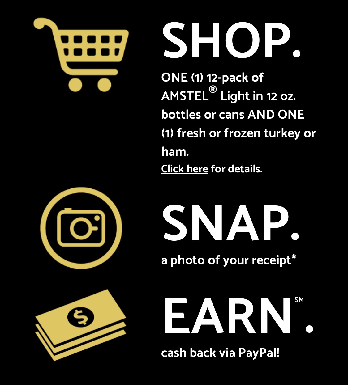 Offer valid in all states EXCEPT AL, AR, HI, IN, KY, LA, ME, MN, MS, MO, NJ, NM, NC, PA, TX, UT, VT & WV. To receive up to $10 through this mail-in rebate, you must purchase ONE (1) fresh or frozen turkey or ham AND purchase ONE (1) 12-pack of AMSTEL®Light in 12 oz. bottles or cans. Residents of VA are eligible for a rebate equal to 50% of the normal retail price of the beer (excl. sales tax), up to a maximum of $10. Maximum of one (1) coupon per individual, email address and receipt. Offer not to be combined with any other offer. Void where taxed or prohibited by law. Valid at all participating licensed off-premise retailers in participating states. You are responsible for sales tax. Offer not available to groups or organizations, or to employees of Amstel USA, its affiliated companies and agencies, licensed alcohol beverage suppliers, wholesalers, and retailers, or members of their immediate families or households. All items do not need to be purchased at the same location. Cash register receipt(s) must be dated between 10/28/2019 and 12/07/2019. All requests for a rebate must be received by 12/07/2019.