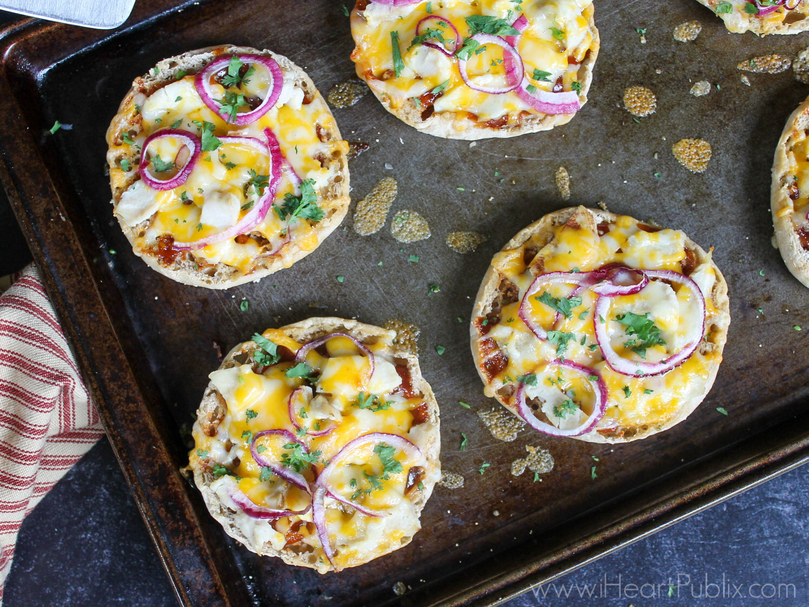 Since English muffins happen to be on sale this week, I figured it was time to add these to my menu. With the BOGO sale on pre-cooked chicken, I knew exactly what kind of pizzas to make…BBQ Chicken English Muffin Pizzas.