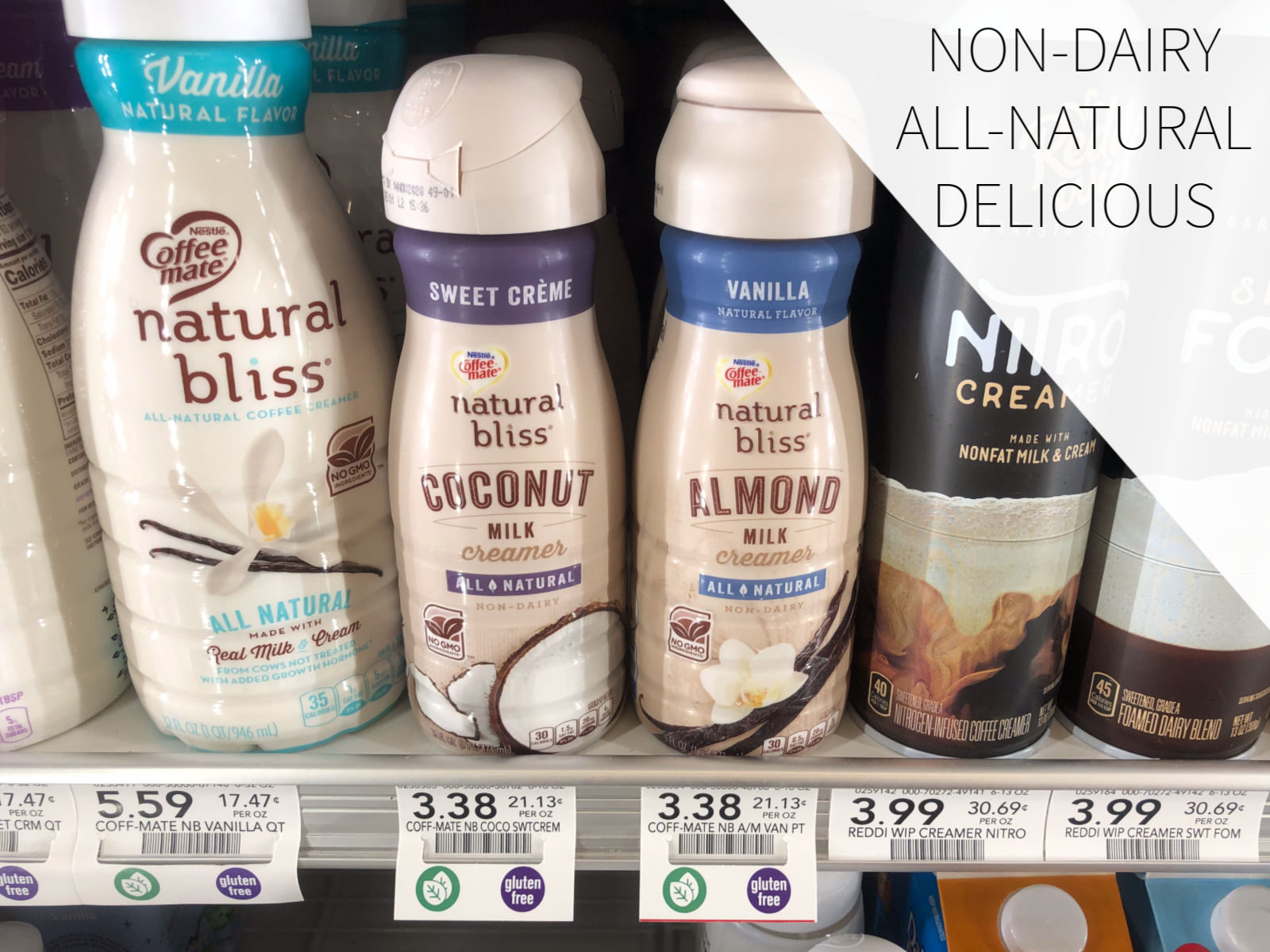 Coffee mate natural bliss® Almond Milk Coffee Creamer and Coffee Mate natural bliss® Coconut Milk Coffee Creamer Sweet Crème are both all-natural, non-dairy coffee creamers that offer great taste with No GMO ingredients*.