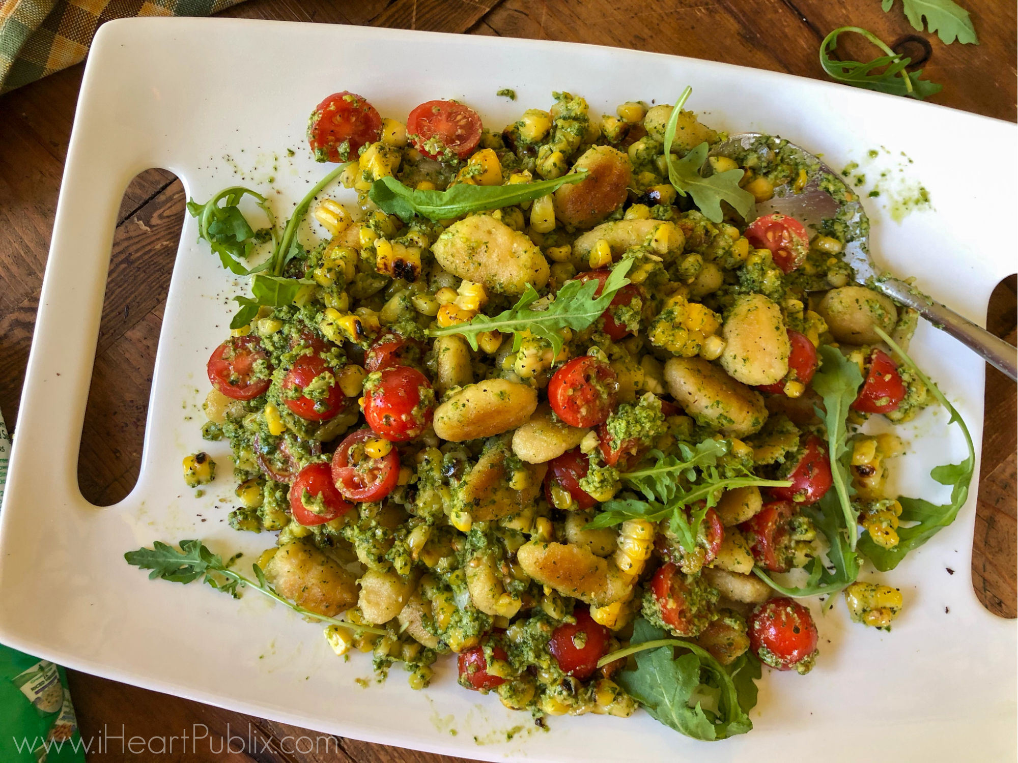 - Toss the cauliflower gnocchi with the grilled corn, tomato halves, and prepared pesto…enjoy!