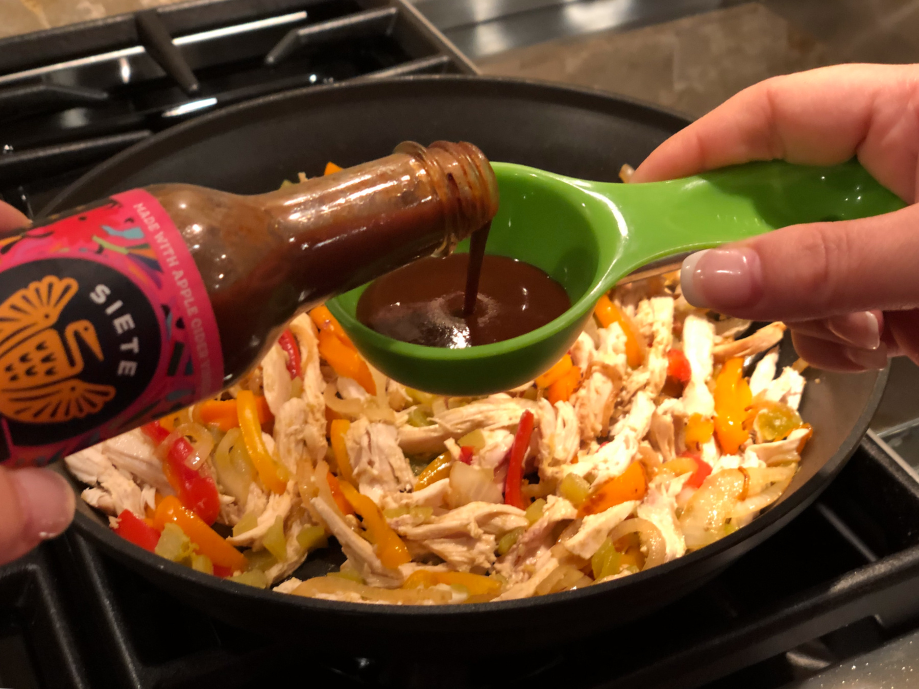 - Add the shredded chicken, diced chilis, cumin and Siete Hot Sauce and stir to combine.