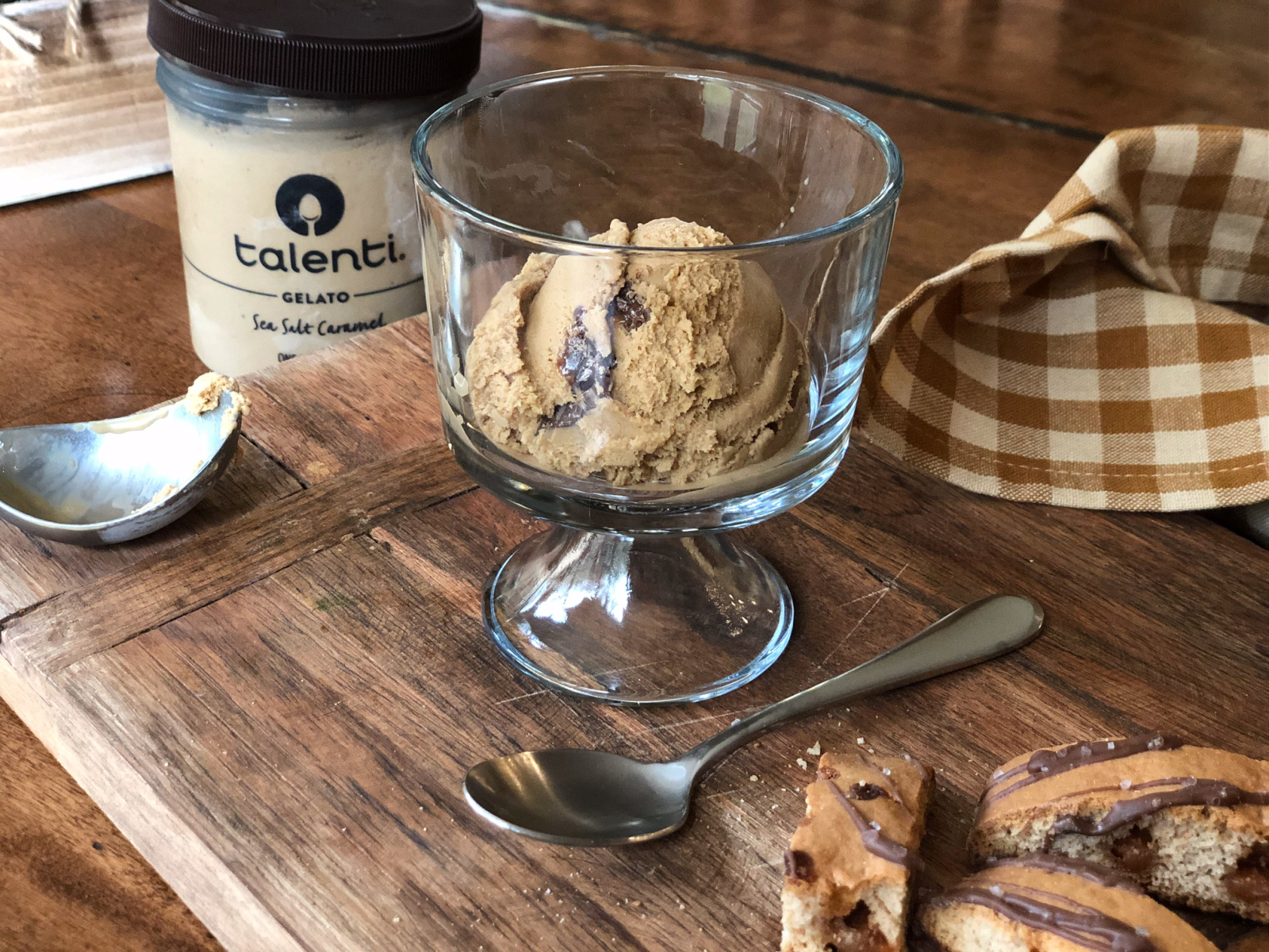 - Place a large scoop of your favorite Talenti Gelato in a coffee cup or glass dish.