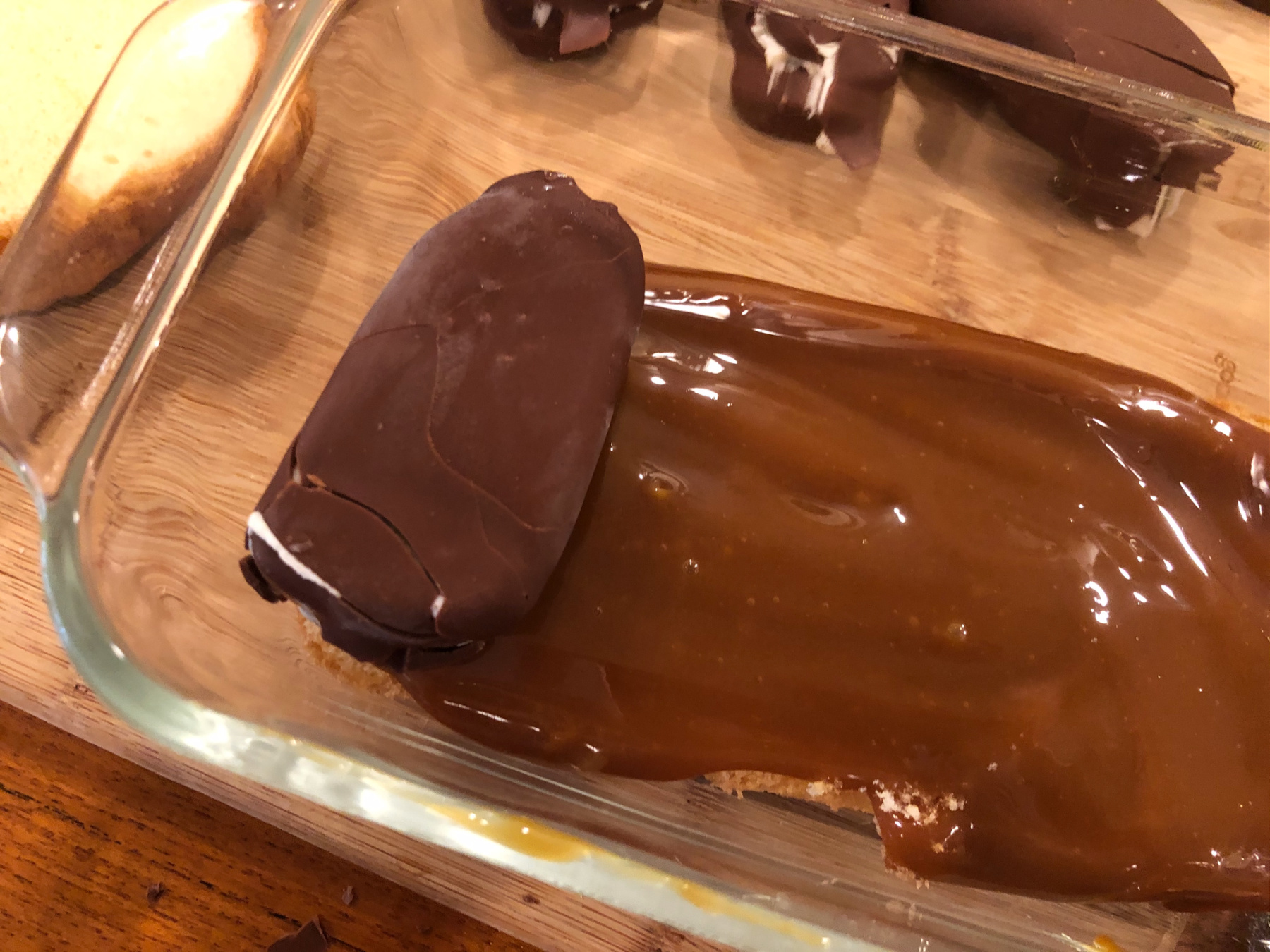 - While the ganache cools, assemble the cake by spreading the salted caramel sauce over the bottom layer of pound cake, followed by the Magnum Mini Double Caramel Bars.