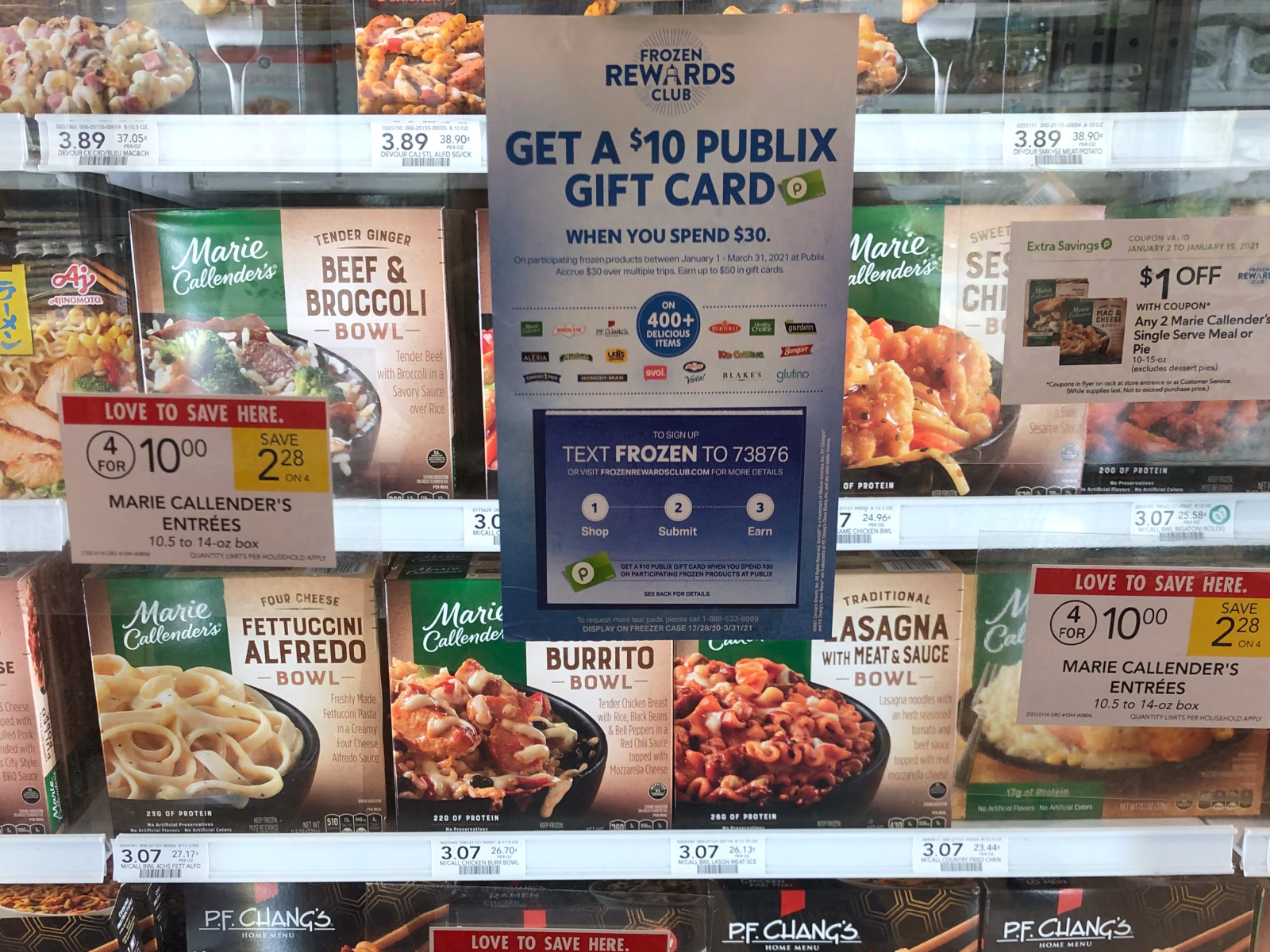 With the Frozen Rewards Club you get a $10 Publix Gift Card when you spend $30 on participating frozen products at Publix between January 1 – March 31, 2021. You can accrue your $30 purchase requirement over multiple trips AND you can earn up to $50 in Publix Gift Cards.