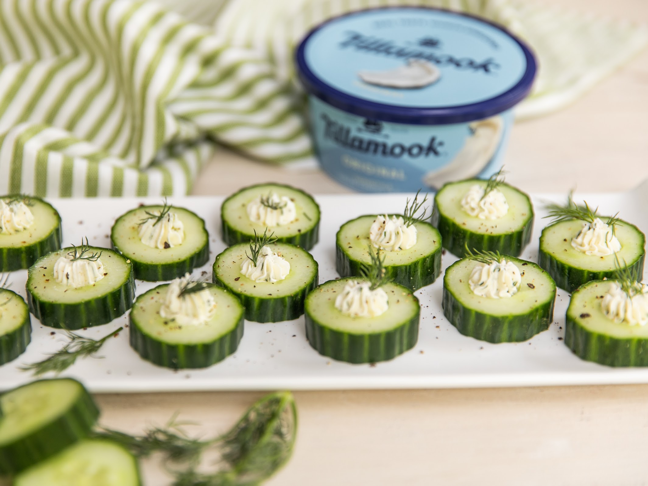 Just mix a little fresh dill and some cracked black pepper with some of that creamy, delicious Tillamook Cream Cheese Spread. You can then spoon or pipe the mixture onto thick slices of cucumber.